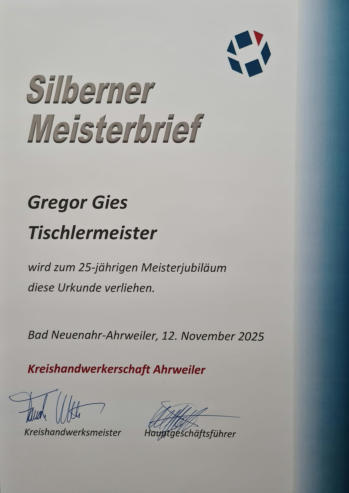 Gregor Gies erhält den Silbernen Meisterbrief im Tischlerhandwerk.